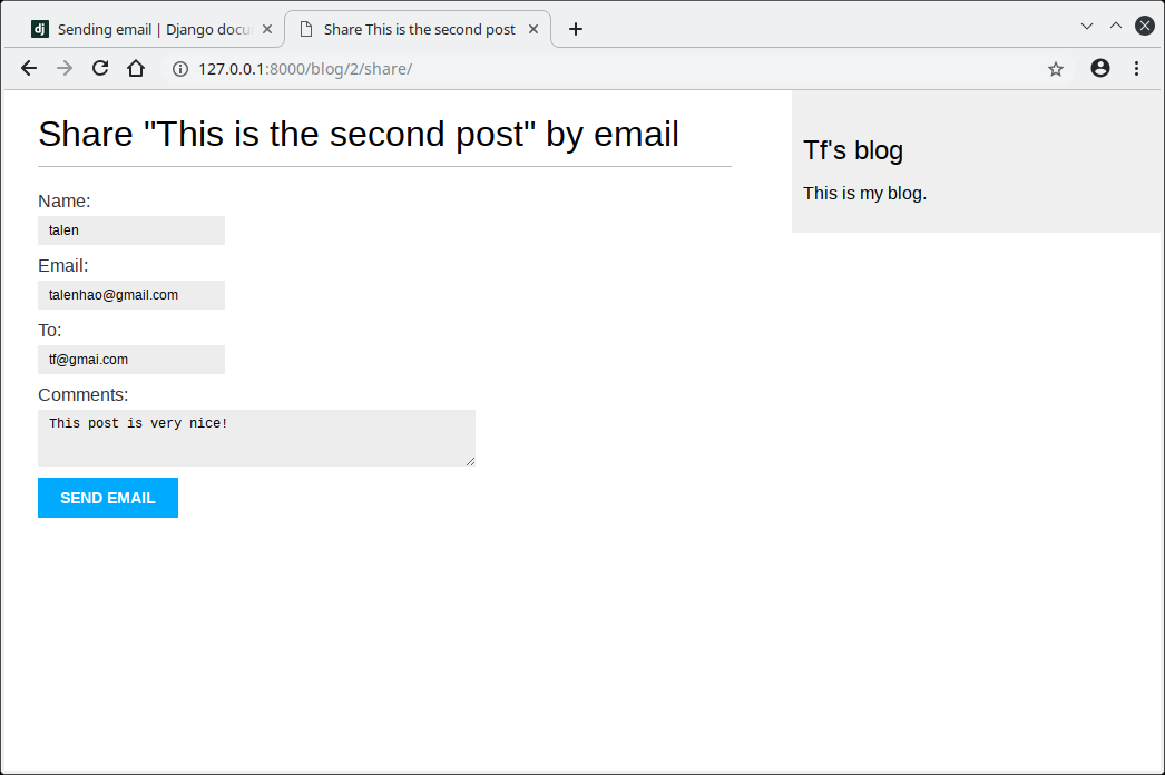 创建表单,编写视图,添加URL匹配后,我们还缺少模板.创建一个新文件blog/templates/blog/post/share.html,添加下面的代码: