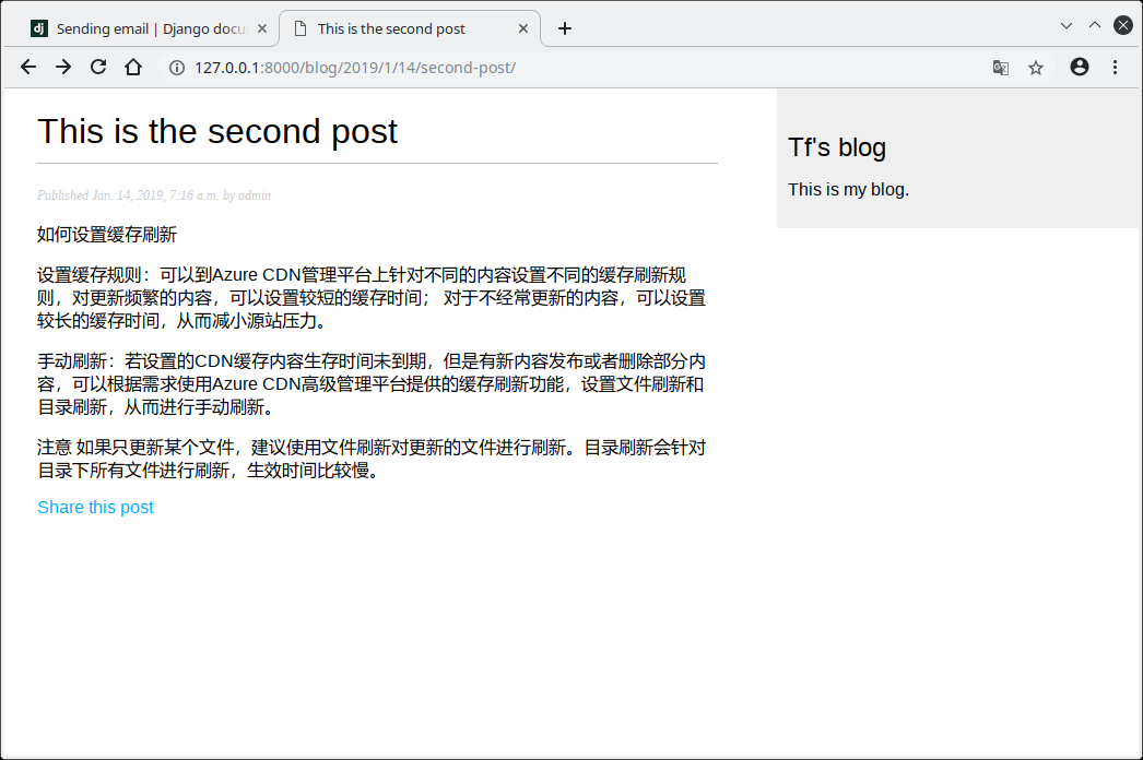 修改blog/post/detail.html模板添加分享链接: