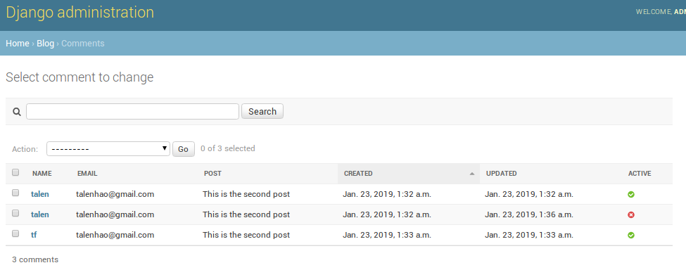 我们创建了一个active布尔字段为了手工关闭不适合的评论.我们使用created创建时间做为排默认排序.