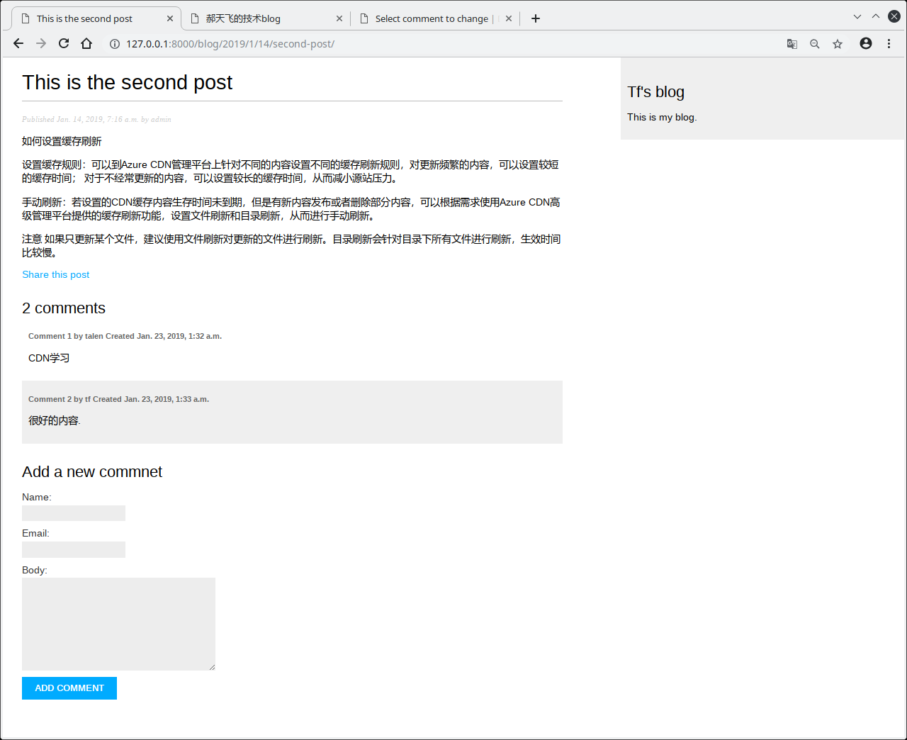 我们已经创建post管理comment的功能.现在,需要对post/detail.html模板做下面的事情: